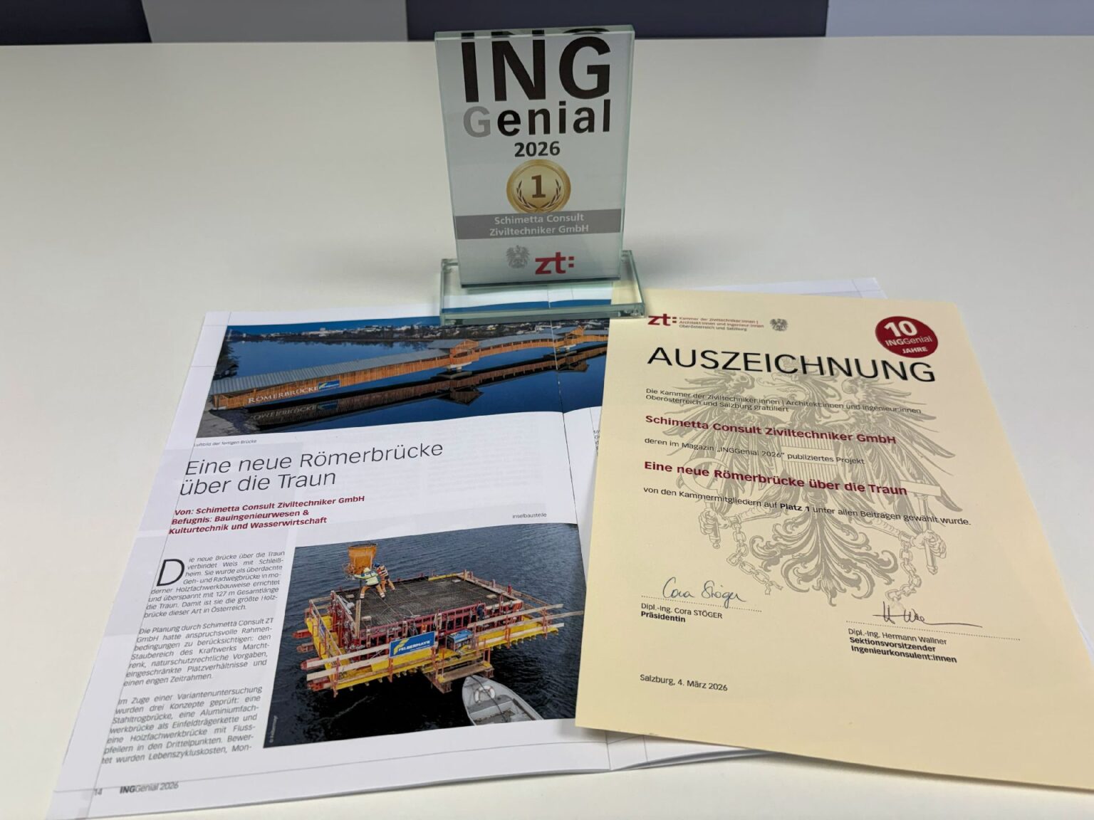 Auch 2026 wurden wieder 16 besondere Projekte vorgestellt – darunter die „Neue Römerbrücke über die Traun“ von Schimetta Consult ZT GmbH. Die Projekte wurden in der Publikation präsentiert und im Rahmen des Weltingenieurtages am 04.03.2026 zusätzlich mit einem Vortrag durch unseren Geschäftsführer Christian Lerchner näher erläutert.